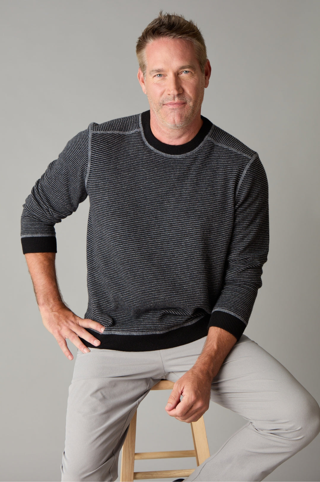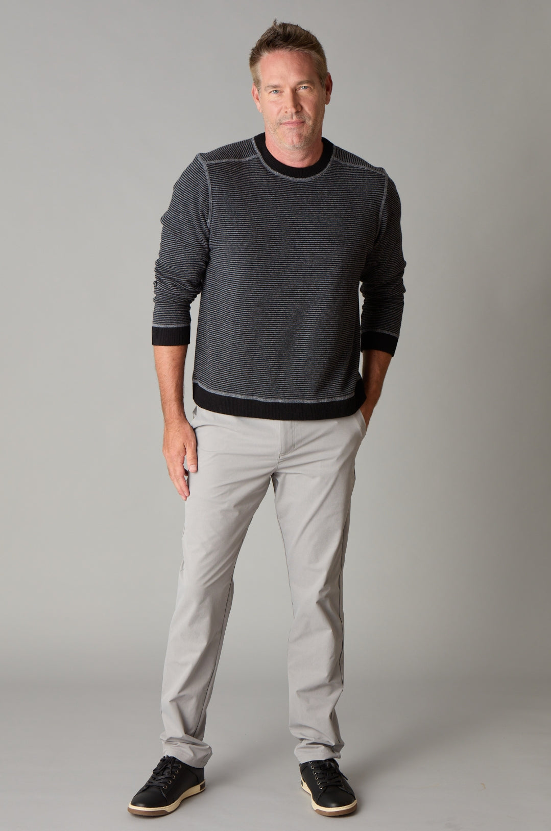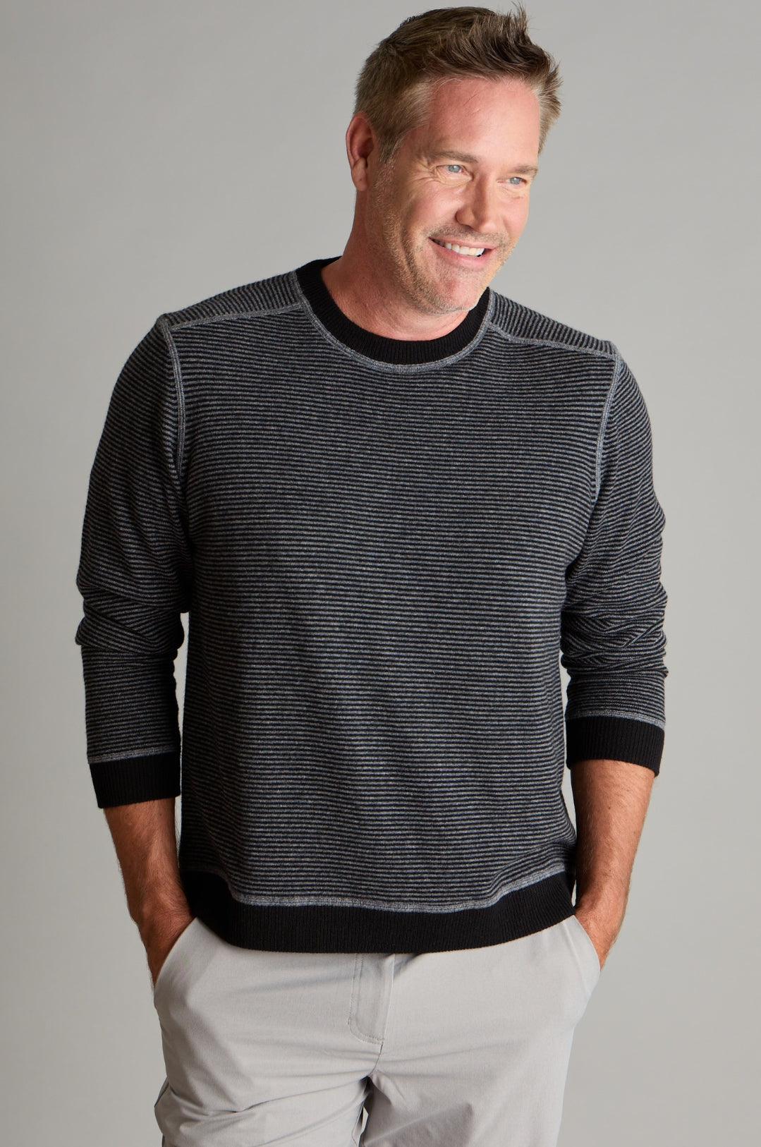 Our fine-line striped pullover is an iconic staple, with roots tracing back to French sailors. This highly-versatile modern take – in a tonal mix of Black Onyx and Charcoal Heather – is perfect for adding a touch of personality to rev up your wardrobe options.